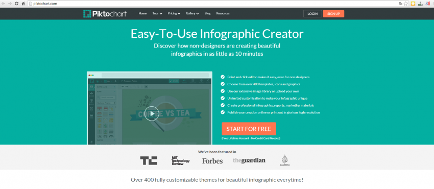 1.PIKTOCHARTPiktochart(www.piktochart.com) – предоставляет инструменты для бесплатного создания инфографики и схем для презентаций на основе ваших данных. Присутствует собственный редактор цветовой гаммы и схем, можно загружать собственные фоны и картинки, а также имеется набор шрифтов.