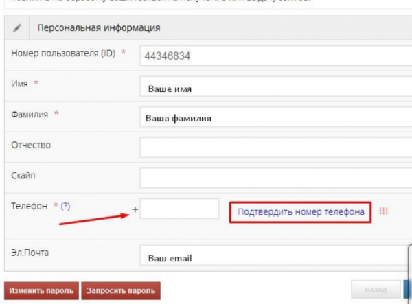 Укажите ваш действующий номер, нажмите на текст «Подтвердить номер телефона», впишите в окошко число, которое придет Вам в виде смс-сообщения. Без подтверждения телефона все последующие шаги невозможны! Не волнуйтесь, это серьезный сервис, и слать Вам спам на телефон никто не будет!