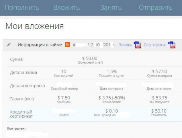 После того как ваша заявка на выдачу кредита будет принята, кликните по хрюшке, чтобы попасть на страницу со списком всех выданных Вами займов. Кликните по строке займа, чтобы посмотреть подробную информацию. Здесь видно, что ваша прибыль за 10 дней составит $7,5. Однако, половина этой суммы будет направлена на формирование Гарантийного фонда проекта. Вам же будет начислено $3,75, которые вы сразу же сможете вывести на ваш кошелек или карту!